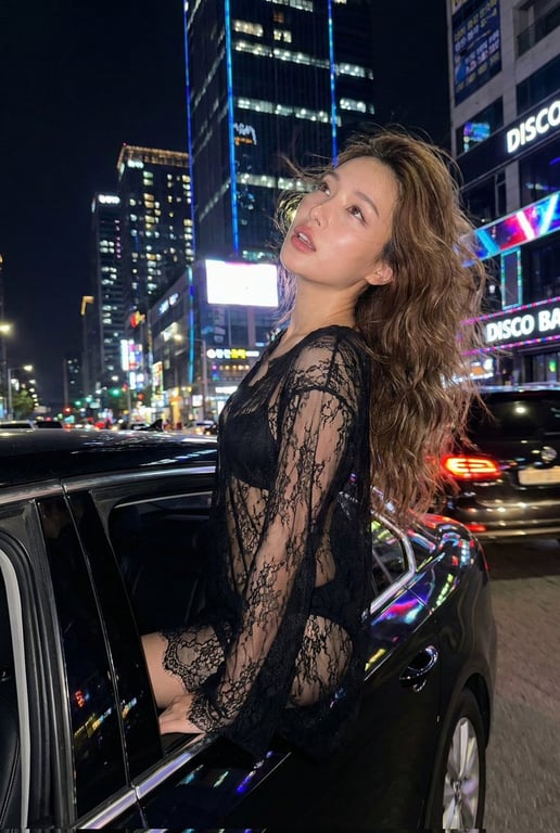 A comprehensive prompt for generating an ultra-photorealistic nighttime fashion photograph. It depicts a woman in a sheer black lace dress sitting sideways in the open window of a glossy black luxury sedan, driving through a neon-lit city street. The prompt emphasizes cinematic lighting, bokeh effects, high dynamic range, and ultra-detailed lace fabric.