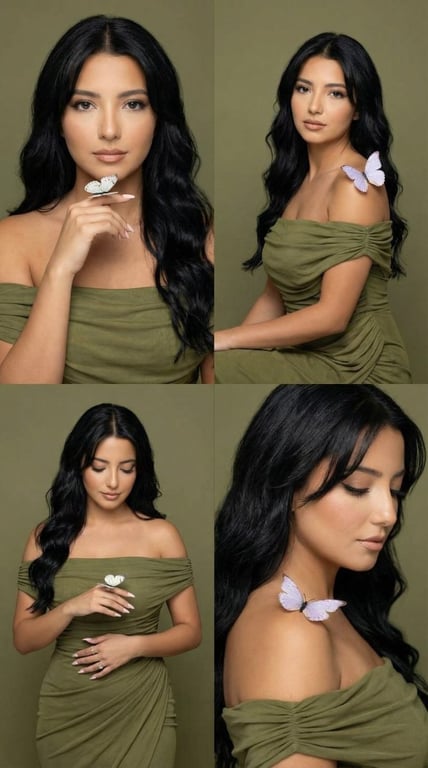 A complex JSON prompt for generating a 2x2 luxury fashion editorial grid, strictly preserving the facial identity of a reference image across all panels, featuring the subject in an olive-green draped dress in a muted studio setting, with soft pastel butterflies as props.