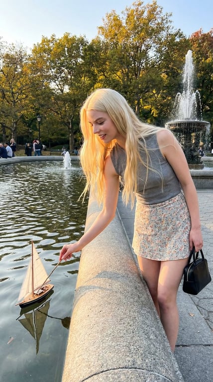 A detailed JSON prompt for Nano Banana Pro to generate a candid lifestyle image of a young woman (identity strictly preserved from a reference image) interacting playfully with miniature sailboats in a park fountain, captured in soft warm daylight with a shallow depth of field.