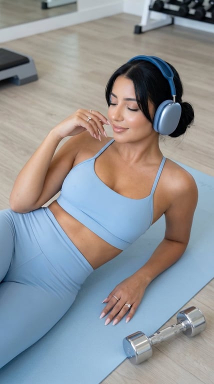 A highly structured JSON prompt for generating an ultra-photorealistic fitness lifestyle portrait using an image-to-image mode. It details the scene (modern gym), lighting, subject description (elegant athletic woman with specific hair/makeup), wardrobe (powder blue set), accessories, pose, and camera settings, with a strong focus on preserving identity and anatomical accuracy.