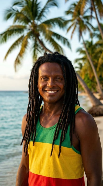 A detailed prompt for Nano Banana 2 to generate a photorealistic, cinematic portrait of the singer Luis Miguel reimagined as a Jamaican reggae musician, emphasizing specific physical features, attire, and a Negril beach setting during the golden hour.