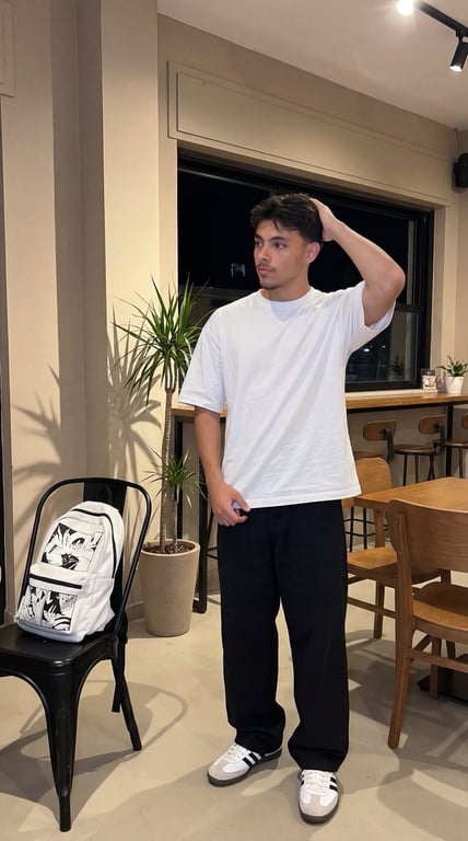 A highly specific, photorealistic image generation prompt in French, instructing the AI to create a lifestyle/editorial photo shoot scene in a street café setting using a provided reference photo. The prompt strictly mandates 100% preservation of the subject's identity (face, proportions, features, age, hair) and specifies fixed parameters for the decor, composition (vertical full-length shot), lighting (harsh direct flash/spam style), attire (oversize white t-shirt, black pants), and pose (standing, hand touching hair, model posture).