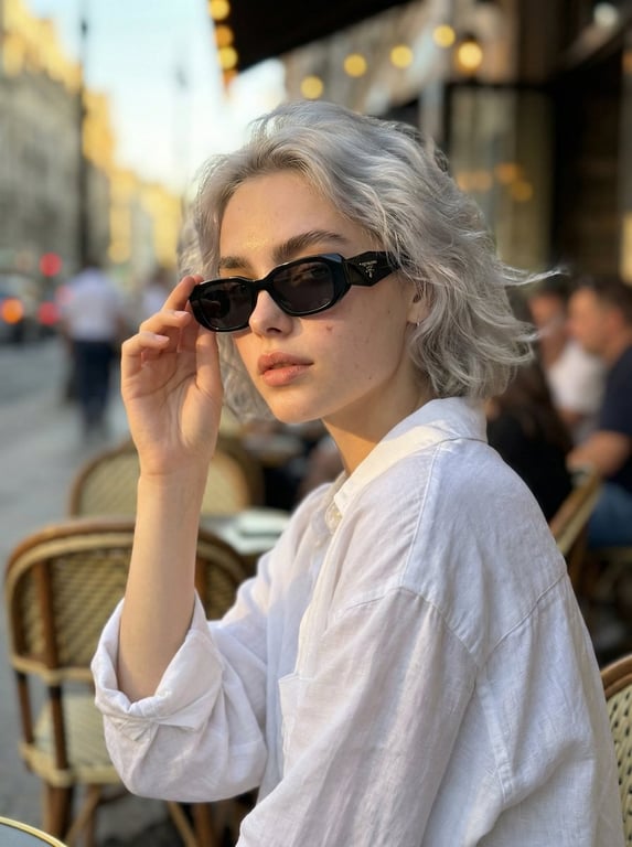A highly detailed photorealistic prompt for generating a portrait of a stylish young woman at an outdoor European café during golden hour. The prompt specifies clothing, hair, makeup, lighting (cinematic golden glow), camera settings (85mm lens, f/1.8), and desired textures (natural skin texture, creamy bokeh).