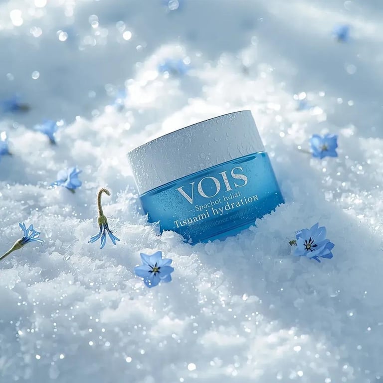 A detailed prompt for generating a photorealistic, high-end commercial image of a blue cosmetic cream jar partially embedded in fresh, icy snow, emphasizing hydration and cold atmosphere with specific camera and lighting settings.