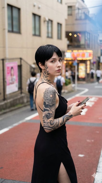 A detailed photorealistic prompt for Nano Banana Pro, designed to generate a high-contrast portrait of a young woman with a sleek black pixie cut and visible tattoos, looking back over her shoulder on a downward-sloping Japanese urban street. The prompt includes specific details about the tattoos, attire (black spaghetti-strap dress), accessories, and the background environment, emphasizing shallow depth of field and soft daylight.