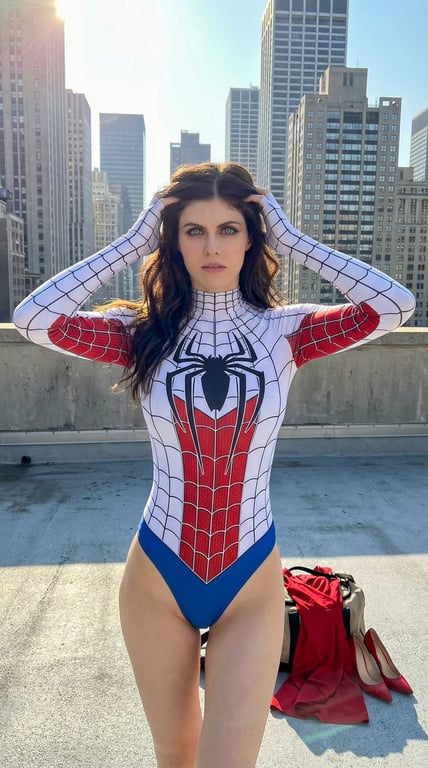 A highly detailed and restrictive prompt for generating a photorealistic portrait of a voluptuous woman in a Spider-Man themed bodysuit on a New York skyscraper rooftop. The prompt explicitly demands preservation of specific anatomical features (heavy projecting bust, wide curvy hips) and forbids any reduction, normalization, or beautification of the curves or volume, aiming for a confident, alluring mood under bright natural sunlight.