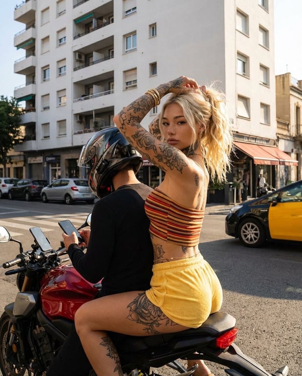 A structured JSON prompt for Nano Banana Pro generating a photorealistic image. The scene is a sunny urban street at golden hour, featuring a stylish, tattooed blonde woman sitting sideways on a red motorcycle, posing confidently while a rider in front checks a phone. The prompt specifies camera settings (85mm lens, shallow depth of field) and includes a detailed negative prompt.