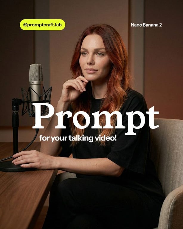 A prompt for generating a professional recording studio environment with acoustic panels and cinematic lighting, intended to serve as a background for an AI talking head video. The prompt text is indicated to be in the third image.