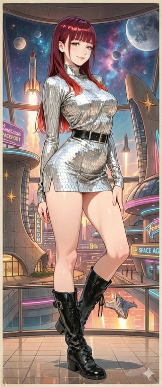 A detailed image-to-image prompt designed for Nano Banana Pro to transform a white background into a retro-futuristic, American pinup-style scene. It incorporates elements of Space Age and Googie architecture, maintaining the original character's pose and expression while focusing on high-resolution background generation with subtle neon and ambient lighting effects.
