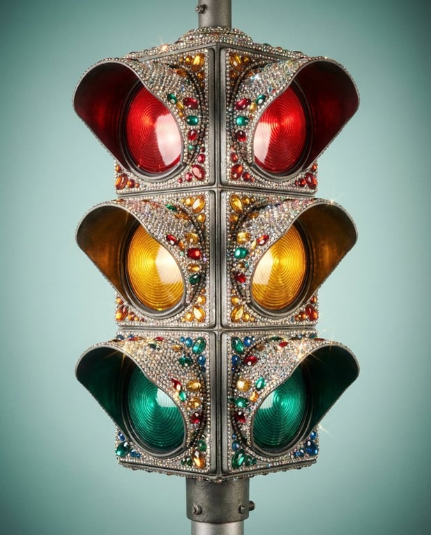 A highly detailed prompt for an image of a vintage traffic light lavishly encrusted with sparkling rhinestones and jewels, set against a light teal background with soft, retro-styled studio lighting.