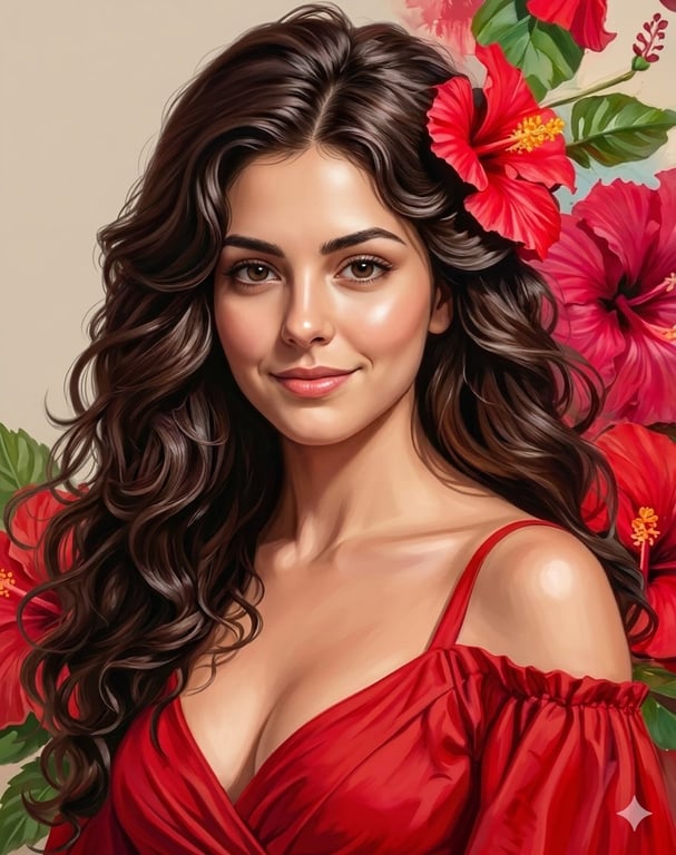 A prompt for generating a hyper-realistic digital portrait of a young woman based on an uploaded photo, featuring voluminous dark hair, a vibrant red off-shoulder dress, and red hibiscus flowers, emphasizing warm lighting and a romantic, elegant atmosphere.