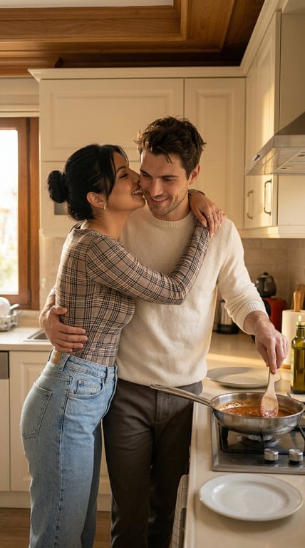 A detailed JSON prompt for generating an ultra-photorealistic, candid lifestyle image of a romantic couple cooking in a cozy Istanbul apartment kitchen. It specifies the location, golden hour lighting, wardrobe, the intimate interaction (woman hugging man from behind while he stirs a pan), camera lens (50mm prime), and extensive quality controls to ensure anatomical accuracy and avoid common AI artifacts.