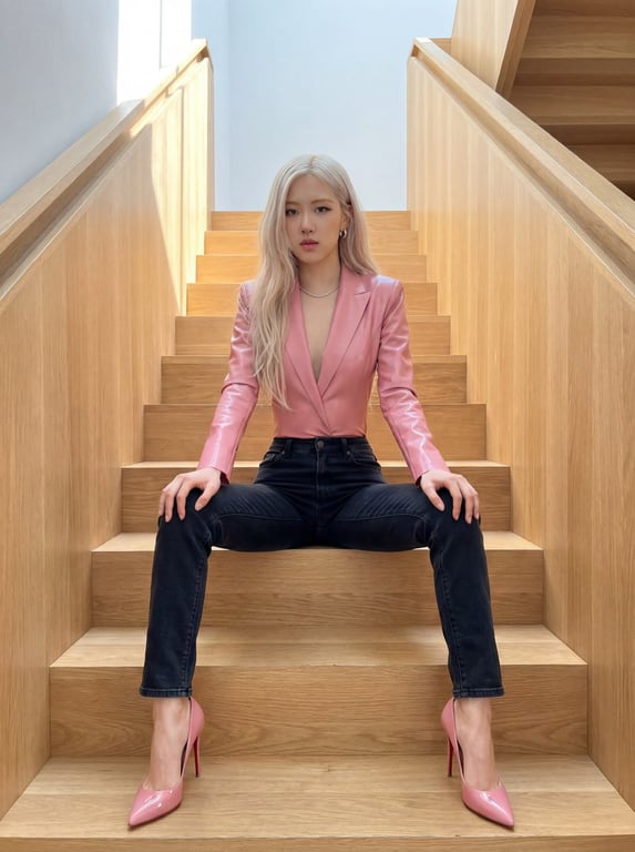 A structured prompt for Nano Banana Pro to generate a photorealistic portrait of K-pop idol Rosé sitting on modern wooden stairs, wearing a plunging pink latex blazer bodysuit and pink stilettos.