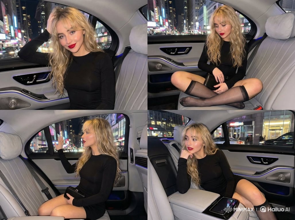 A detailed JSON prompt for Nano Banana Pro to generate an ultra-photorealistic, high-fashion editorial portrait of Sabrina Carpenter in the back seat of a luxury car at night. The prompt specifies warm interior lighting mixed with colorful city lights, her pose (legs pulled up, finger on lip), outfit (black mini dress, sheer stockings), and camera settings (iPhone 15 Pro Max, 9:16 aspect ratio).