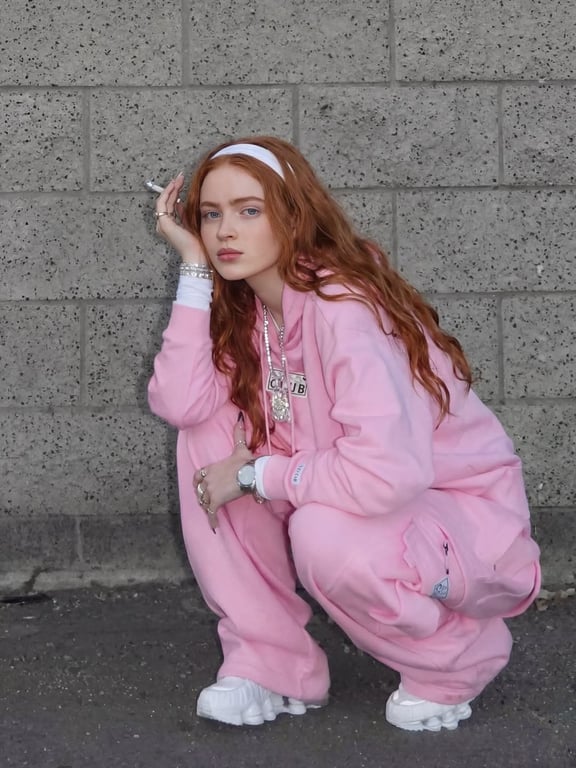 A prompt for generating a high-resolution, full-body portrait of Sadie Sink in a cozy, oversized pink loungewear set, squatting against a cinder block wall, capturing a candid, urban fashion aesthetic with soft lighting.