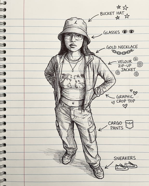 A simple prompt instructing the model to convert an uploaded photograph into a hand-drawn sketch with annotations, lines, doodles, and arrows identifying each item of clothing on notebook paper.