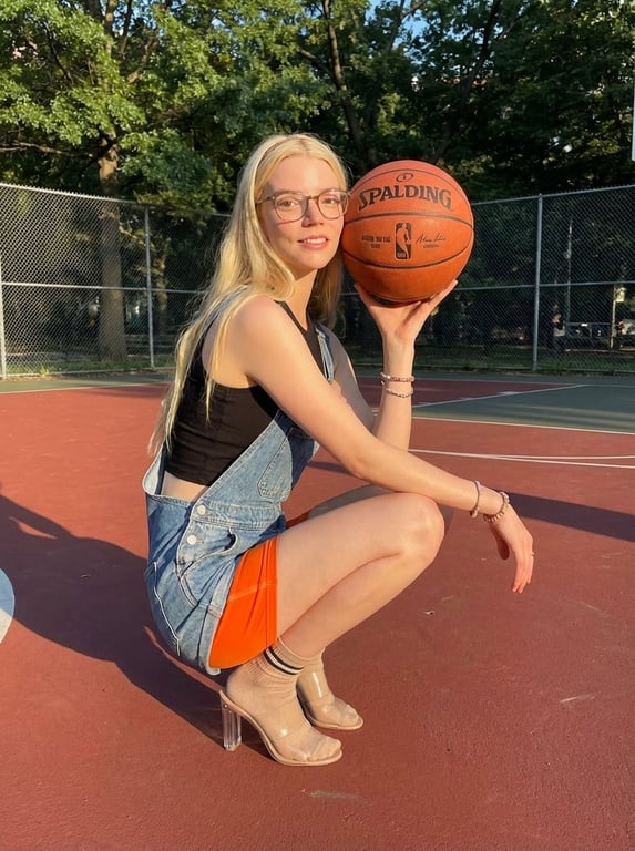 A detailed prompt for Nano Banana Pro to generate a lifestyle editorial image of Anya Taylor-Joy in a 'soft girl meets sporty' aesthetic, squatting on an outdoor basketball court during golden hour, emphasizing strict identity lock and photorealistic details.
