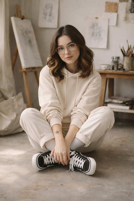 A structured image generation prompt for creating a soft, natural photograph in an art-school aesthetic. It describes a young woman sitting cross-legged in a quiet studio, emphasizing muted neutral colors, diffused natural lighting, and a candid, unpolished mood.