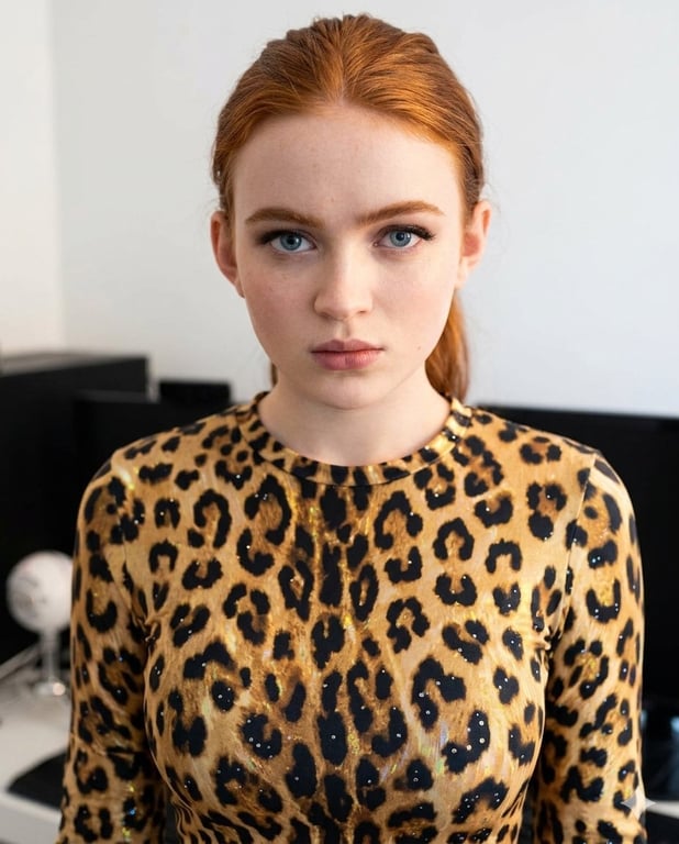 A detailed, structured JSON prompt for Gemini Nano Banana Pro to generate a photorealistic portrait of a young woman wearing a sparkly leopard print top in an indoor setting, emphasizing specific features, pose, and lighting.