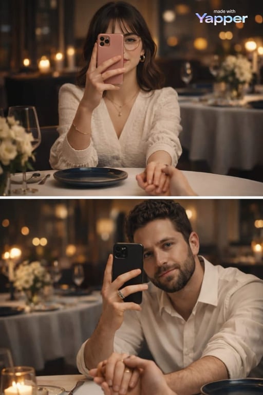 A detailed photorealistic prompt for Nano Banana 2 creating a split-screen composition of a dinner date, capturing both a young woman and a young man mirroring poses while taking a selfie and holding hands. The prompt specifies lighting, setting, and texture details for a Pinterest-style, real vision human skin aesthetic.
