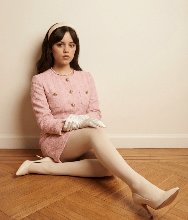 A highly structured JSON prompt for Nano Banana Pro defining an ultra-high resolution, photorealistic fashion portrait. It meticulously details the camera settings (50mm lens, f/5.6), the subject's pose (seated on the floor, legs crossed at the ankle), and the outfit (pastel pink tweed mini dress, ivory opaque tights, and gloves).
