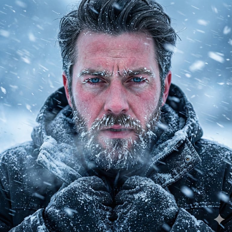 A structured JSON prompt for Nano Banana Pro aimed at generating an ultra-realistic 8K close-up portrait of a rugged man enduring a brutal snowstorm. It includes an identity safety clause for face preservation and specifies the subject's appearance, such as wind-burned skin and intense eyes, for a cinematic documentary aesthetic.