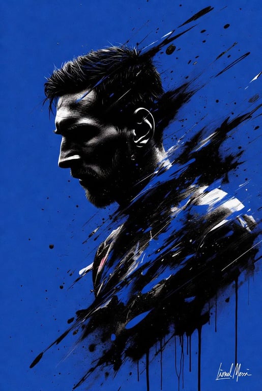 A prompt for converting an uploaded image into a dramatic, stylized 9:16 portrait. It features a dark, silhouetted figure in profile against a deep electric blue background, with intense black and sapphire paint splashes creating a sense of motion and energy. The prompt requires the AI to maintain the facial features of the uploaded photo.