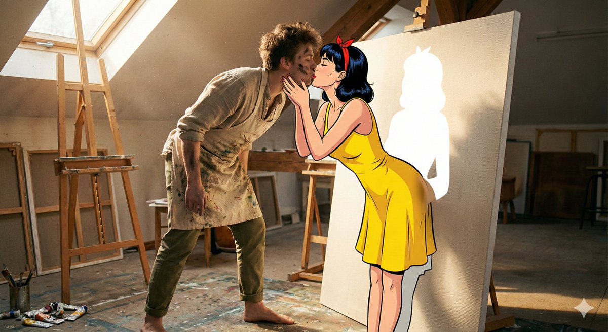 A highly detailed, structured prompt designed for an advanced LLM like Gemini 3, instructing it to generate an image of an intimate kiss between a male artist and his 'Living Illustration.' The prompt meticulously defines the characters, the emotional tone, and the complex dimensional transition where the 2D illustration's upper body emerges into 3D space while the lower body remains anchored flat on the canvas, specifying anatomical continuity and visual physics.