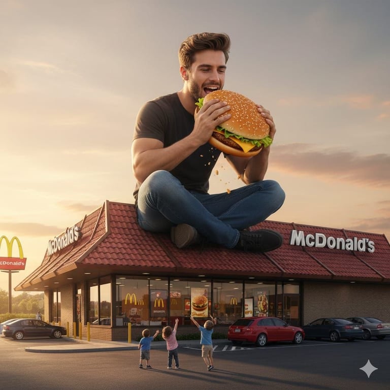A prompt for generating a surreal, ultra-realistic advertising image featuring a dramatic scale contrast: a giant man sitting on a McDonaldâs roof eating an oversized cheeseburger, with tiny people below. It emphasizes cinematic wide-angle perspective, golden-hour lighting, and hyper-detailed food textures for a playful fantasy realism style.