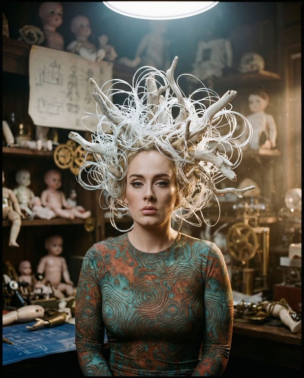 A highly detailed, high-concept editorial prompt for Gemini Nano Banana Pro, generating a hyper-realistic, medium-format portrait of a female subject ('The Artificer') with surreal, avant-garde hair made of fiber-optic wires and driftwood, set in a cluttered Antique Automaton Workshop, emphasizing cinematic lighting and film texture.