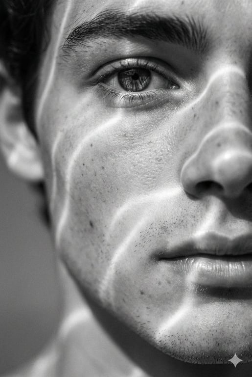 A prompt for generating a hyperrealistic 8K black and white macro portrait. It focuses on extreme close-up detail of the face, using surreal, wavy luminous lines of light that ripple across the skin like underwater reflections, creating an intimate and dreamlike aesthetic.