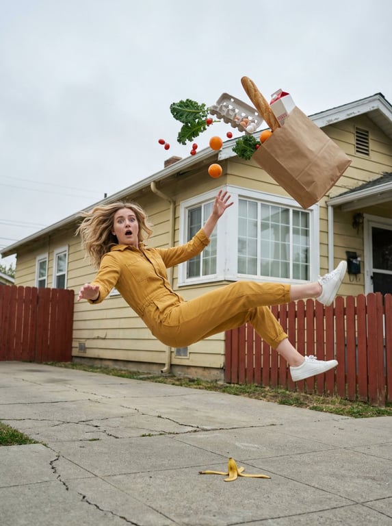 A highly detailed prompt for generating a cinematic, surreal image of a young woman falling backward in mid-air on a suburban street, with a grocery bag exploding and items floating around her, emphasizing frozen action and comedic panic.