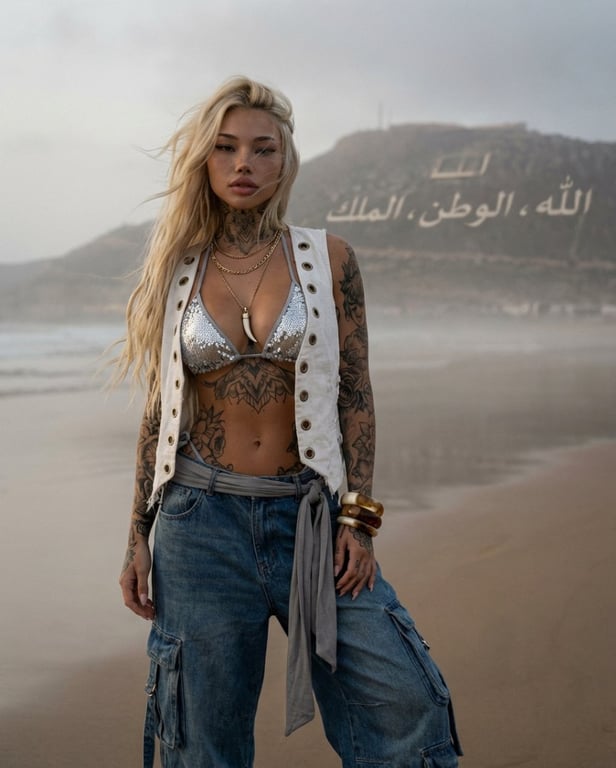 A prompt for generating a cinematic, high-fashion editorial portrait of a tattooed blonde woman standing on a misty beach. The outfit is a mix of a sequined bikini top and loose cargo jeans, set against a foggy shoreline with faint Arabic lettering in the background, creating a moody, empowered aesthetic.