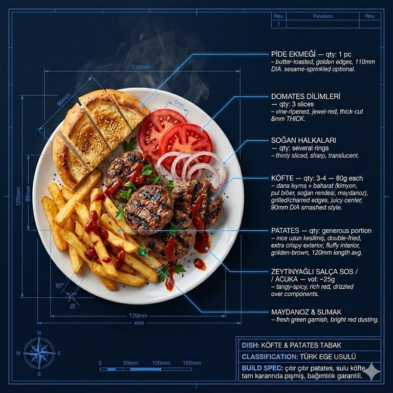 A highly detailed, structured prompt for Gemini Nano Banana Pro, requesting a hyperrealistic image of the Turkish dish Köfte & Patates rendered as a technical architectural blueprint. It specifies colors, lighting, labeling (CAD style), ingredients, and mood, aiming for clinical precision and appetite appeal.