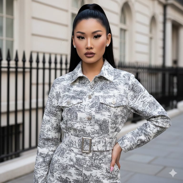 A Gemini Nano Banana Pro prompt for generating a fashion editorial image set on an urban street. It features a woman in a matching toile de jouy patterned denim jacket and trousers, focusing on polished makeup, sleek hair, and a monochromatic color palette with soft pink accents, aiming for a modern street style aesthetic.