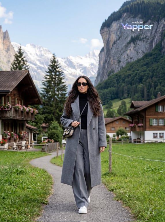 A structured JSON prompt for Nano Banana Pro, designed to generate an ultra-realistic travel lifestyle photograph. It features a female subject walking confidently in a stylish outfit (turtleneck, oversized coat) through a Swiss-style alpine countryside village, emphasizing natural daylight, high detail, and a luxury countryside aesthetic.