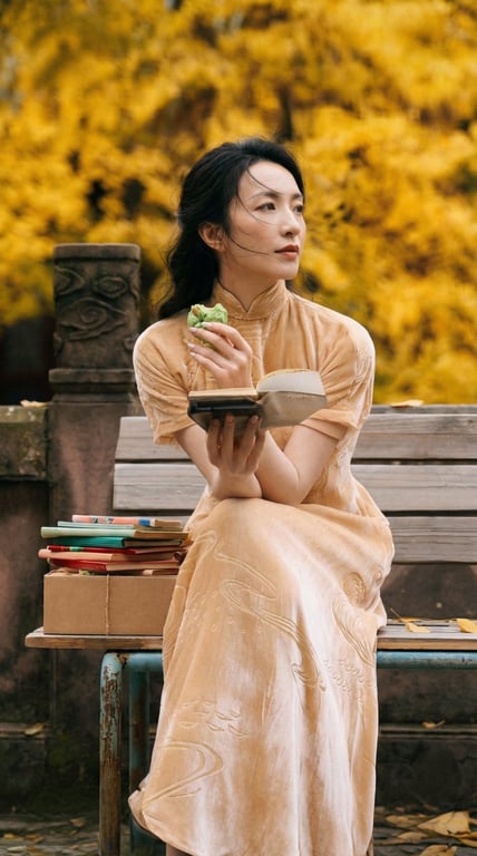 An extremely comprehensive, multi-section prompt for Nano Banana Pro to generate a high-fashion, New Chinese aesthetic portrait in an autumn setting. The prompt specifies the role of the AI as a world-class fashion photographer, dictates precise facial feature replication, detailed scene setting (vintage chair, Chinese architecture), specific attire (apricot cheongsam), lighting (Golden Hour), and technical parameters (8K, film grain, shallow depth of field).