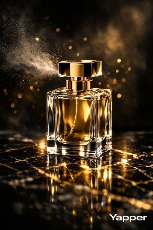 A prompt for Google Nano Banana Pro to generate an ultra-luxurious perfume campaign photograph, focusing on macro product detail, polished black marble, soft cinematic lighting, and a high-end fashion advertising aesthetic.