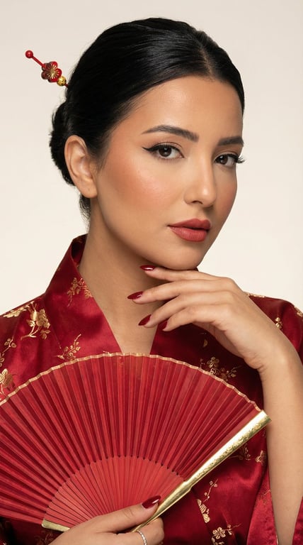 A highly structured image-to-image prompt for an ultra-photorealistic editorial beauty portrait. It requires preserving the subject's pose and hand structure from a reference image while transforming the styling into a Japanese-inspired red kimono theme with matching accessories, focusing on detailed skin texture and soft beauty lighting.