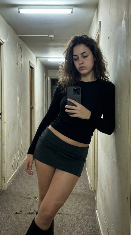 A detailed, structured prompt for generating an ultra photorealistic image resembling a raw iPhone selfie taken late at night in an empty apartment hallway, focusing on a specific character and outfit description with strict rules against exaggeration.