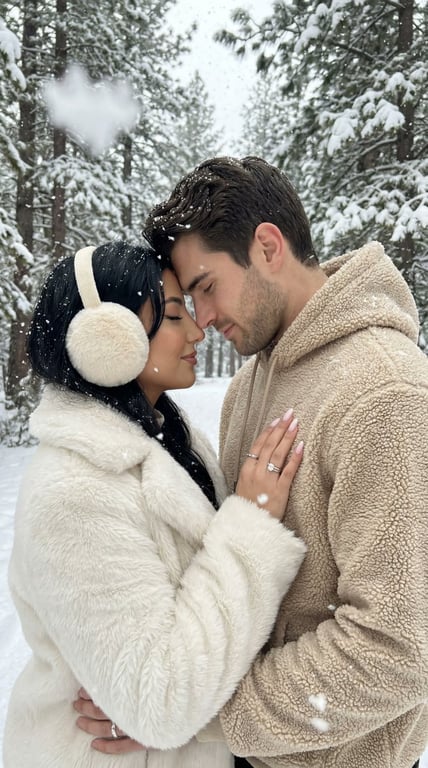 A highly detailed JSON prompt for generating an ultra-photorealistic, cinematic lifestyle portrait of a couple embracing in a snowy winter forest. It specifies wardrobe (faux-fur coat, sherpa hoodie), intimate poses, diffused overcast lighting, and technical settings for high resolution and realistic snow/fabric textures.