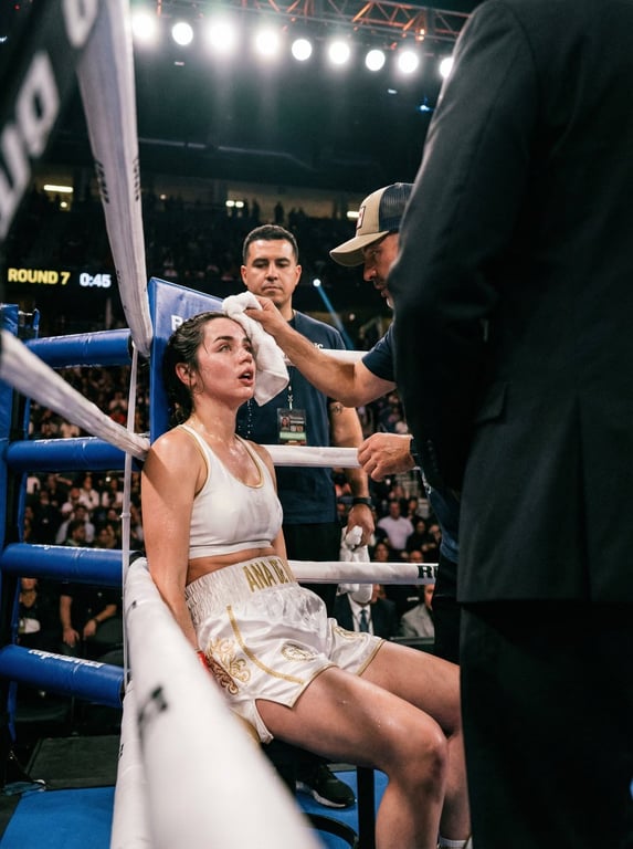 A highly detailed, structured prompt for generating an ultra-realistic sports documentary photograph of an exhausted but determined female boxer (implied to be Sydney Sweeney) resting in the corner of a ring between rounds, focusing on raw details like sweat, realistic skin texture, and the tight, immersive ringside atmosphere.
