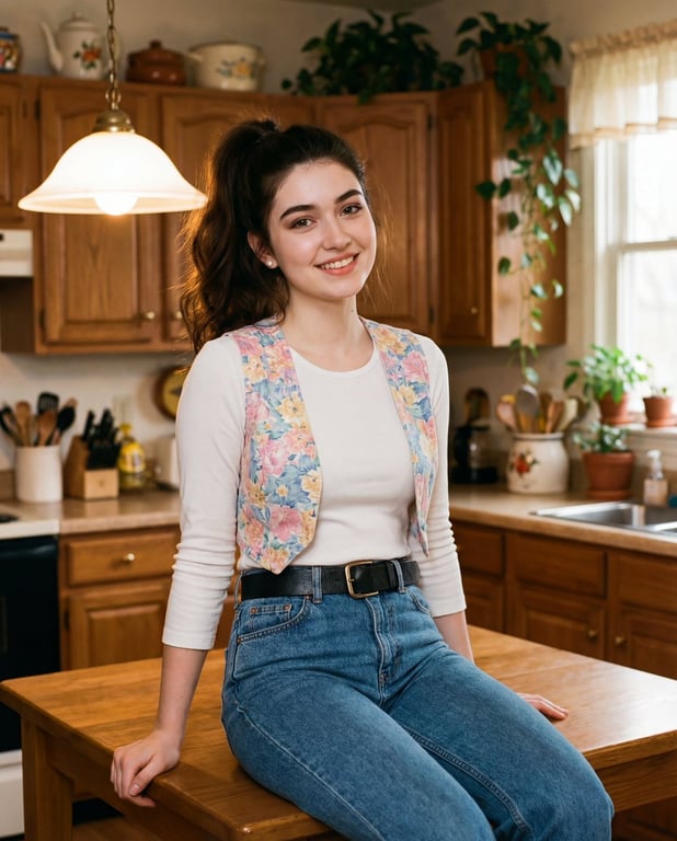 A detailed image generation prompt designed for Gemini Nano Banana Pro to create an ultra-realistic cinematic film still from the early 1990s. The scene is set indoors in a cozy, lived-in home, focusing on a young woman posing playfully under warm, soft lighting, complete with specific details on clothing, hairstyle, and makeup to achieve a nostalgic Western vibe.