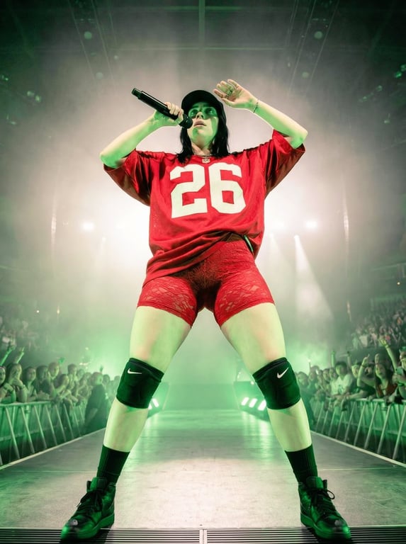 A highly detailed, structured prompt designed for generating an ultra-realistic concert photograph of a female stage performer, specifically Billie Eilish, using dramatic green stage lighting and an extreme low-angle perspective to emphasize dominance and energy.