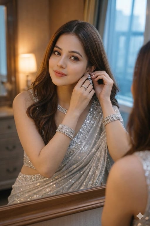 An ultra-realistic portrait prompt for Nano Banana Pro that requires the AI to maintain 100% facial identity from an uploaded photo. The subject is adjusting her earrings in front of a mirror, wearing a silver half-draped saree, with specific details on hair, makeup, and cinematic lighting (warm lamp key light with cool window fill light).