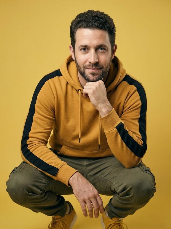 A prompt for Nano Banana 2 to generate an ultra-realistic studio portrait of a stylish young man in a mustard yellow hoodie, squatting casually against a solid yellow background, emphasizing fashion editorial style and sharp focus.