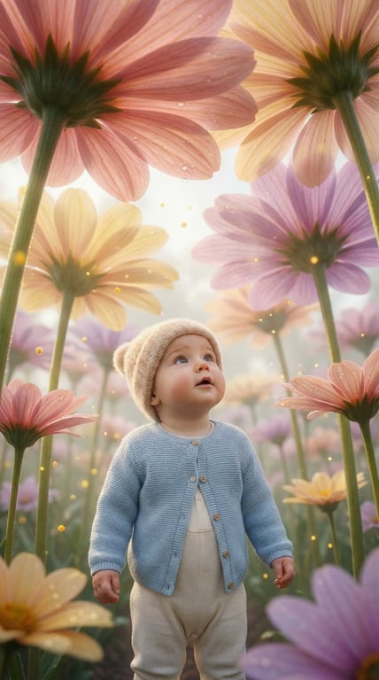 A detailed prompt designed for comparing multiple image generation models (Nano Banana Pro, DALL·E 3, Grok Imagine). It requests an ultra-realistic, surreal conceptual portrait of a baby standing in a field where flowers are impossibly tall. The prompt specifies the baby's appearance, the magical atmosphere (volumetric light rays, misty haze), and cinematic technical details (wide-angle, shallow depth of field, 8K quality).