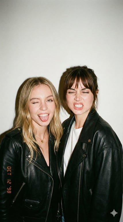 A highly detailed, structured prompt for generating an ultra-realistic candid analog film photograph with a late 90s/early 2000s disposable camera aesthetic. It specifies harsh direct flash lighting, heavy film grain (Kodak Portra 400 emulation), and detailed descriptions of two subjects in leather jackets making goofy, spontaneous expressions.
