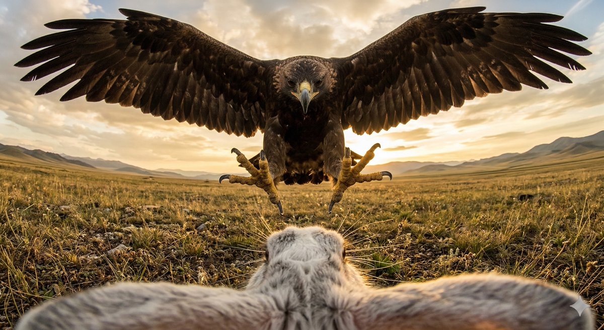 A prompt for Gemini Nano Banana 2 to generate a dramatic, ultra wide-angle cinematic photo captured from the perspective of a rabbit about to be caught by a Golden Eagle.