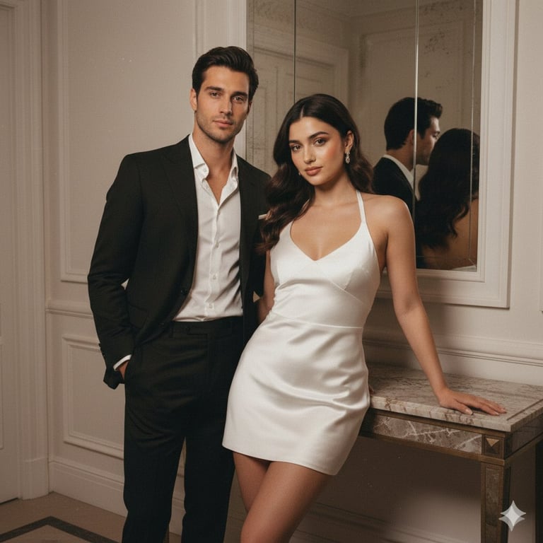 A JSON prompt for generating a couple's portrait with a vintage warm flash aesthetic, similar to the single portrait prompt but adapted for two subjects. It enforces strict face preservation from input photos and specifies the scene (luxury hallway, mirror reflection), lighting (hard warm flash), and wardrobe (white satin mini dress for female, tailored black suit for male).